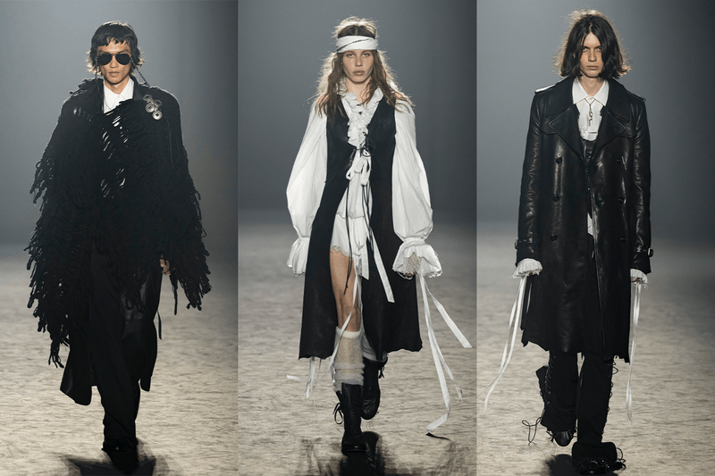 Ruffled fabrics were melded together to create miniature dresses with lace trimmings, accompanied by fringed boots and wrapped headbands. Inflated sleeves transformed traditional shirting into something new, accompanied by vintage-style vests and uneven top hats. Elsewhere, shredded knitwear and pointed blazers gave off an edgy feel, while sleeveless coats, shearling outerwear, and deconstructed graphic tees were made for rebellious individuals.