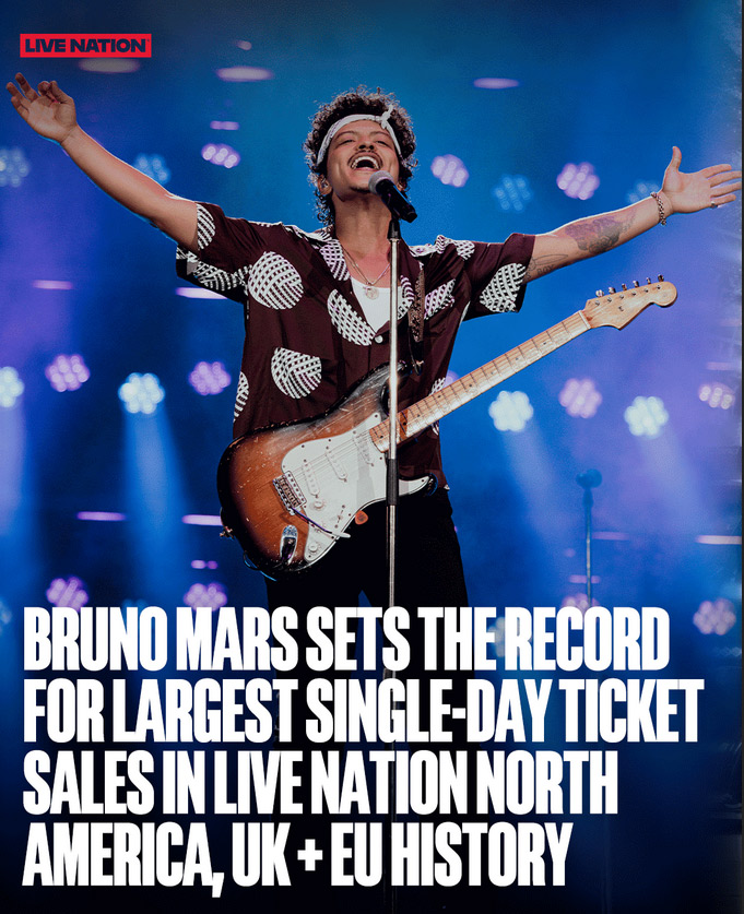 The post Bruno Mars Sets the Record for Largest Single-Day Ticket Sales in Live Nation History Across North America, Europe, and the UK. first appeared on Rap Industry: New Hip Hop, Rap Videos, Music, News, & more..